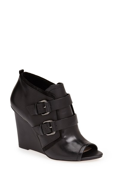 Subtle suede trim and gunmetal buckles add a distinctive downtown edge to this open-toe bootie that's balanced with a street-smart, recessed wedge. Color(s): black leather/black suede, olive leather/olive suede. Brand: 10 Crosby Derek Lam. Style Name