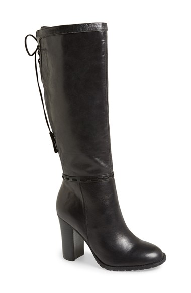 A saucy tasseled lace-up detail at the back calf adds a bit of flounce to every step in a grainy-textured leather boot set on a chunky stacked heel. Color(s): black, nutmeg. Brand: Adam Tucker. Style Name: Adam Tucker 'Kisha' Leather Boot (Women