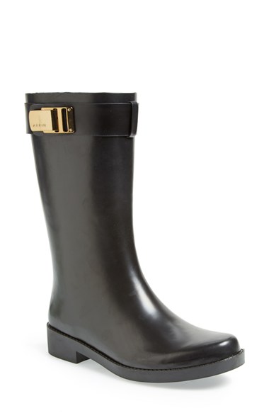 A polished goldtone logo buckle highlights the shaft of a sleek boot that's waterproof in case you feel like splashing through a puddle or two on your way to work. Color(s): black rubber. Brand: AERIN. Style Name: Aerin 'Adera' Rain Boot (Women). Style Number: 712363.