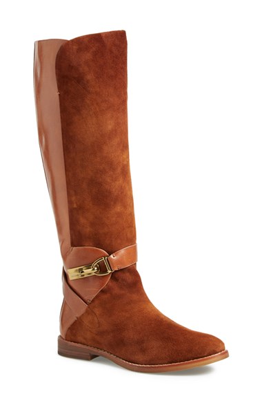 A split, mixed-material shaft adds interest to a sleek knee-high boot styled with a wraparound belt and polished goldtone hardware. Color(s): black, cognac suede, espresso. Brand: AERIN. Style Name: Aerin 'Matilda' Tall Boot (Women). Style Number: 899940.