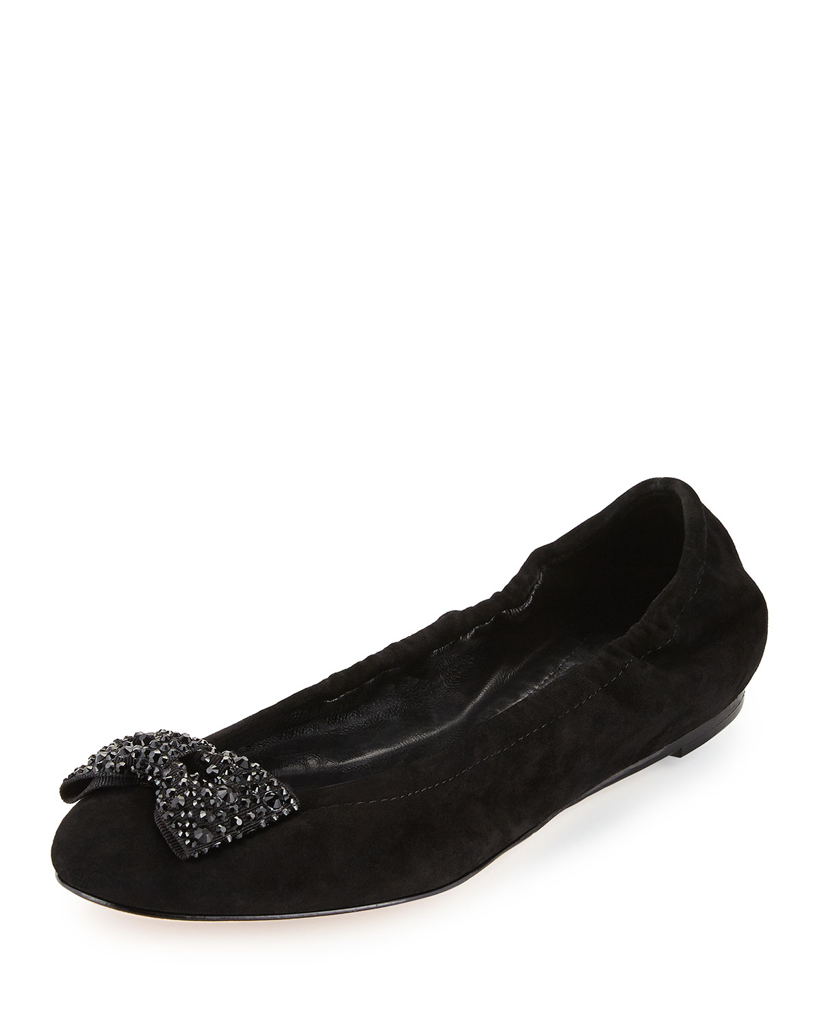 Alice + OliviaDixon Embellished Bow Ballet Flat, BlackDetailsAlice + Olivia nubuck leather ballet flat. Round toe. Rhinestone embellished bow on vamp. Stretch collar for ease of dress. Padded leather insole; leather outsole. Imported. Designer About Alice + Olivia: Its initial collection of low-rise, well-fit pants in vibrant shades and prints made Alice + Olivia famous. Designer Stacey Bendet expanded the line since then to include a full collection of pieces cherished for their perfect fit and eye-catching flair.