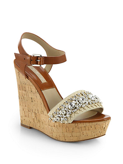 Glimmering crystals and rope embroidery put a fancy twist on these towering cork wedges of supple leather and suede.;Cork wedge, 3.5" (90mm);Cork platform, 1.5" (40mm);Compares to a 2" heel (50mm);Leather, suede, embellished and embroidered upper;Adjustable ankle strap;Leather lining and sole;Padded insole;Imported