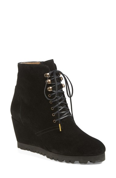 A covered wedge heel boosts an urban-chic bootie styled in lush Italian suede. Color(s): black suede, espresso, graphite suede, military suede. Brand: ANYI LU INTERNATIONAL. Style Name: Anyi Lu 'Fiona' Bootie (Women). Style Number: 546343.