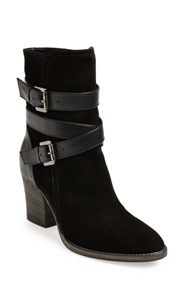 A fall-favorite bootie cast in weatherproof suede gets a trend-right update with smooth leather straps wrapping the shaft. Color(s): black suede, mud suede. Brand: Aquatalia by Marvin K. Style Name: Aquatalia by Marvin K. 'Floria' Suede Bootie (