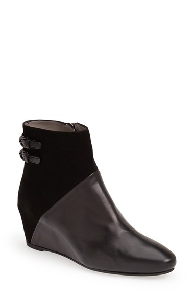 Slim buckle straps accent the heel of a suave ankle boot that contrasts lush suede with smooth leather and features a signature weatherproof finish that ensures impeccable style no matter the weather. Pre-order this style today! Add to Shopping Bag to view approximate ship date. You'll be charged only when your item ships. Color(s): black nappa. Brand: Aquatalia by Marvin K. Style Name: Aquatalia by Marvin K. 'Petunia' Weatherproof Wedge Bootie (Women). Style Number: 800343.