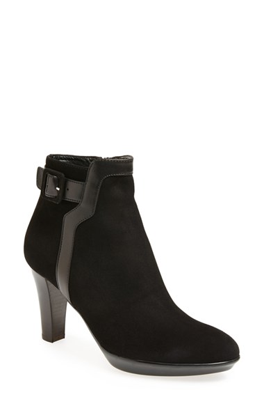 An asymmetrical topline with tonal leather detailing defines a belted ankle bootie balanced on comfortably high stacked heel. The supple Italian suede upper has been treated with Aquatalia's exclusive weatherproofing technique, ensuring the boots' durability and your dry feet. Color(s): black suede combo, charcoal suede combo, espresso suede combo, navy suede combo, plum suede combo, vino suede combo. Brand: Aquatalia by Marvin K. Style Name: Aquatalia by Marvin K. 'Rae' Bootie (Women). Style Number: 743076.