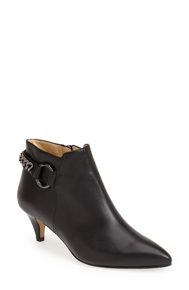 A polished silvertone ring secures the chunky chain strap on a moto-inspired bootie shaped with a pretty pointed toe and a kicky kitten heel. Pre-order this style today! Add to Shopping Bag to view approximate ship date. You'll be charged only when your item ships. Color(s): black calf. Brand: Aquatalia by Marvin K. Style Name: Aquatalia by Marvin K. 'Selina' Weatherproof Leather Bootie (Women). Style Number: 800402.