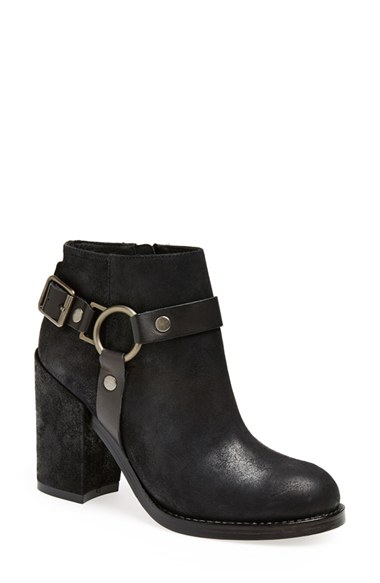 A chunky covered heel adds modern lift to a lightly distressed leather bootie wrapped with a rugged, moto-inspired harness. Color(s): black/ black, t moro brown. Brand: Ash. Style Name: Ash 'Falcon' Leather Bootie (Women). Style Number: 879870.