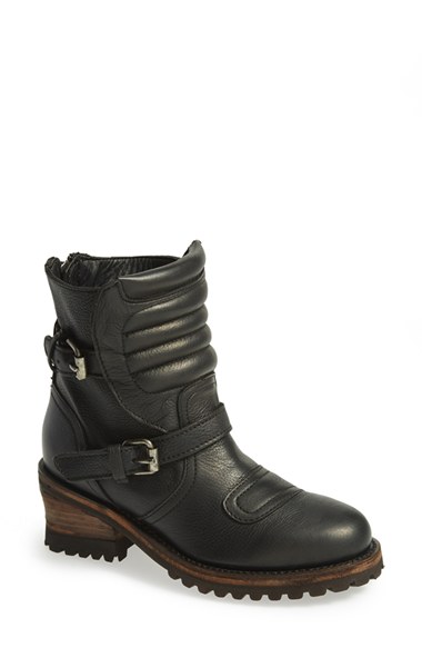 A stacked heel comfortably boosts a leather moto boot styled with a trio of buckled straps and a quilted vamp. Color(s): black. Brand: Ash. Style Name: Ash 'Speed' Leather Boot (Women). Style Number: 758292.