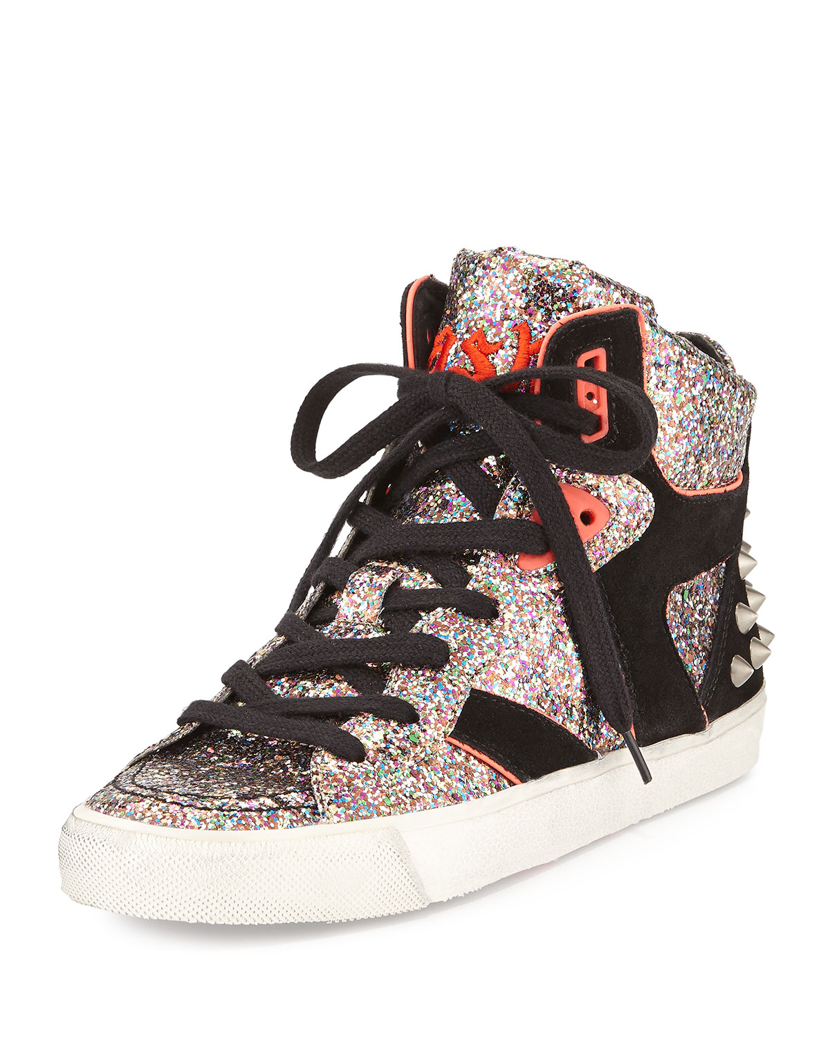AshSpirit Studded Glitter Sneaker, Black/Starlight/Fluorescent PeachDetailsAsh multicolor glitter and suede sneaker.1" flat heel. Round toe. Contrast trim. Studded heel. Lace-up front; logo appliqu? padded tongue. Padded collar. Padded footbed. Lugged rubber sole."Spirit" is imported. Designer About Ash: In 2000, Leonello Calvani and Patrick Ithier introduced Ash, a collection of footwear that reflects the duo's experience in the world of French luxury. After spending time at some of France's leading shoe fashion houses, the pair merged an appreciation for fine Italian leather and craftsmanship with a fashion-forward vision.