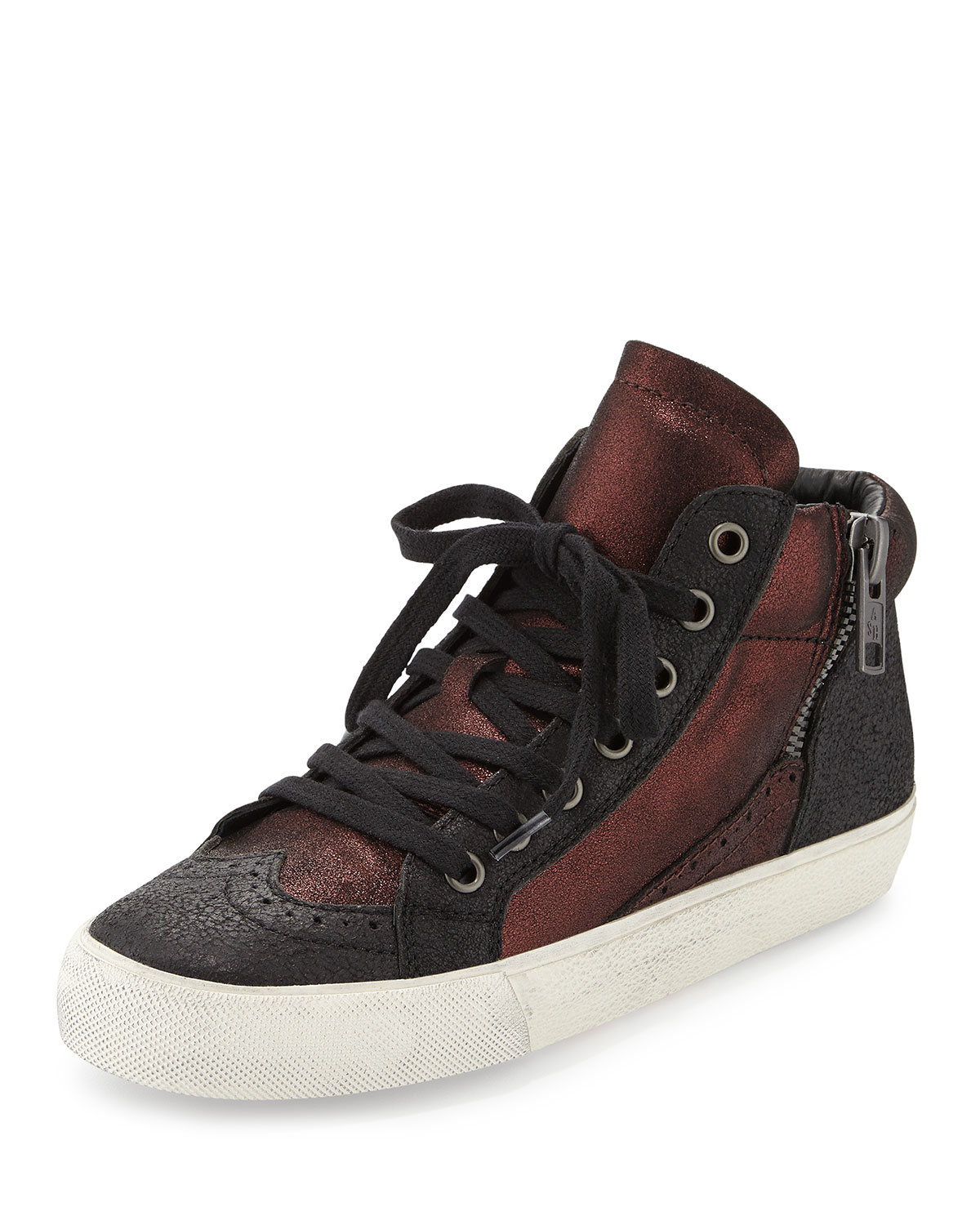 AshSpot Double-Zip Sneaker, Black/WineDetailsAsh leather and suede sneaker. Round toe with wingtip detail. Lace-up front. Side zips ease dress. Flat platform rubber sole. Imported. Designer About Ash: In 2000, Leonello Calvani and Patrick Ithier introduced Ash, a collection of footwear that reflects the duo's experience in the world of French luxury. After spending time at some of France's leading shoe fashion houses, the pair merged an appreciation for fine Italian leather and craftsmanship with a fashion-forward vision.