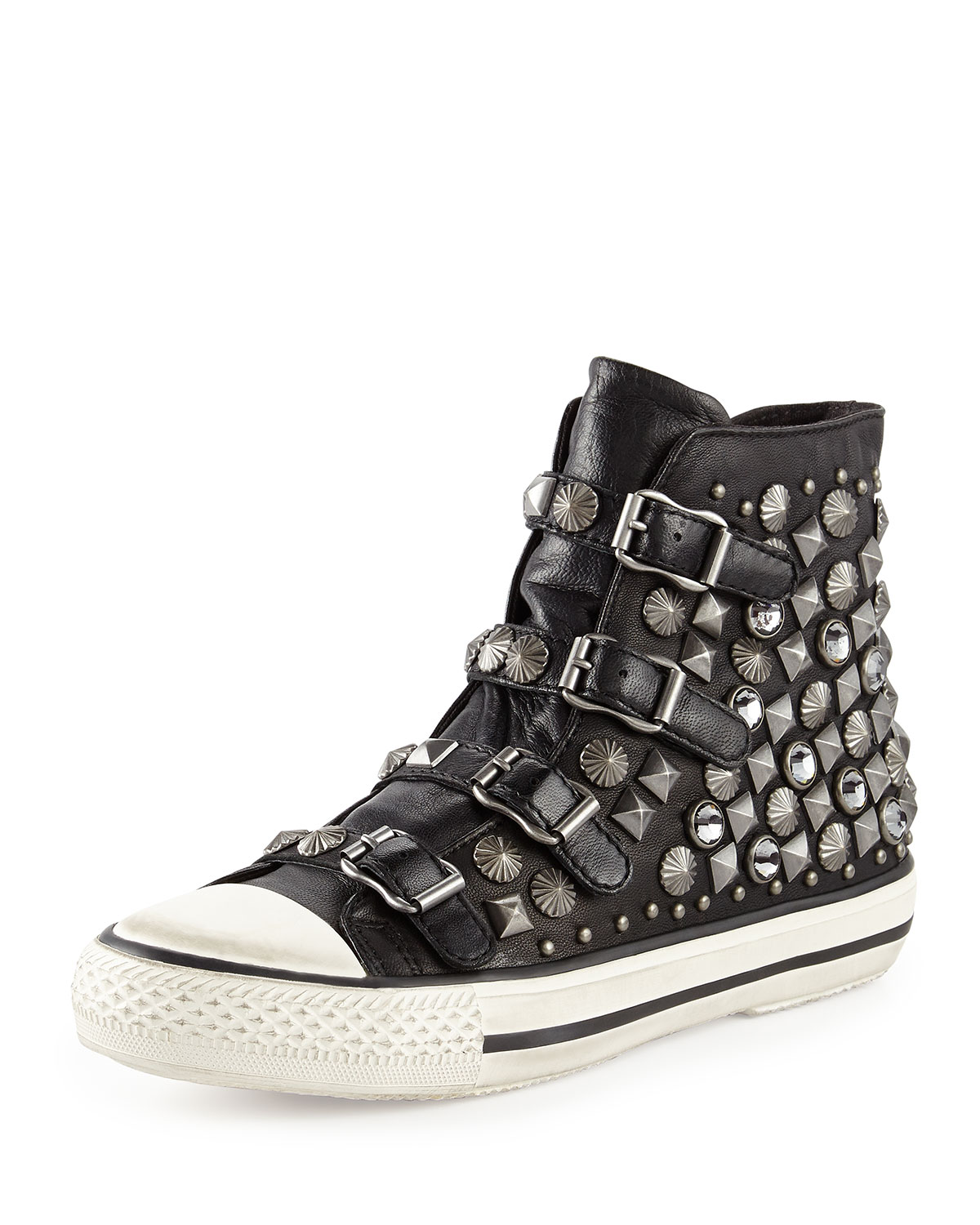 AshVictim Leather Studded High-Top Sneaker, BlackDetailsAsh high-top sneaker with leather upper. Approx. 4 1/2" height. Round rubber toe. Silver studded detail with clear smokey/grey colored gem studs. Leather strap front with silver buckles. Cushioned leather insole. Canvas lining. Rubber sole. Side zip closure. Imported. Designer About Ash: In 2000, Leonello Calvani and Patrick Ithier introduced Ash, a collection of footwear that reflects the duo's experience in the world of French luxury. After spending time at some of France's leading shoe fashion houses, the pair merged an appreciation for fine Italian leather and craftsmanship with a fashion-forward vision.