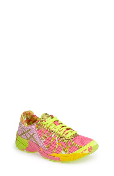 ASICS went above and beyond to create a lightweight, triathlon-style shoe with a host of running-specific features including a seamless, breathable-mesh construction with GEL cushioning pods for ultimate comfort. A glow-in-the-dark print keeps it fun and practical while laces and a hook-and-loop closure offer a secure, snug fit. Color(s): hot pink/ gold ribbon. Brand: ASICS. Style Name: ASICS 'GEL Noosa Tri 9' Running Shoe (Big Kid). Style Number: 849788 1.