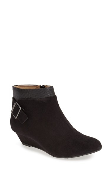 Snake-embossed panels play against the lush suede of a lightly weathered bootie lifted by a slight wedge heel. Color(s): black suede, stone. Brand: BC FOOTWEAR. Style Name: BC Footwear 'Save Me' Bootie (Women). Style Number: 806411.