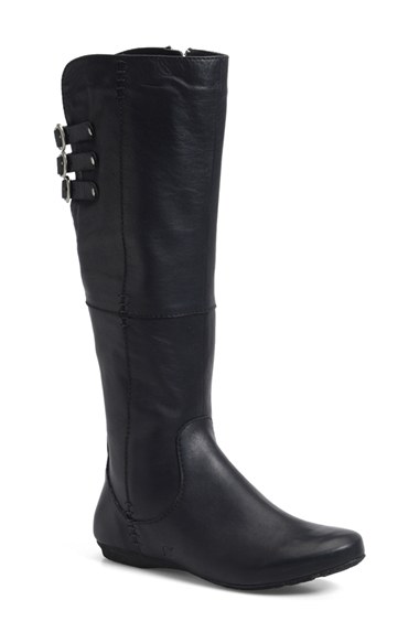 A trio of belted straps cross the cutout shaft of a full-grain leather boot featuring signature Opanka handcrafted comfort construction and set on a flexible rubber sole. Color(s): black, whiskey. Brand: Born. Style Name: Born 'Luana' Knee High
