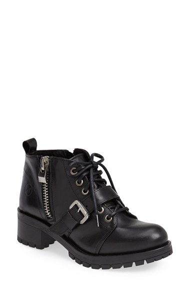 A little bit combat, a little bit biker and a whole lot of attitude-this leather bootie is anything but dainty with its military laces and moto belts. The bold, lugged sole and round toe cut complete the toughened-up look Color(s): black. Brand: Bronx. St