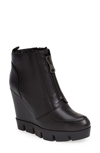 Smooth, semigloss leather composes an edgy bootie lifted by both a sleek wedge and a super-chunky lugged platform sole. Color(s): black. Brand: Bronx. Style Name: BRONX USA 'Key to Bee' Wedge Bootie (Women). Style Number: 804384.