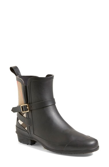 Signature checks style the mid-height shaft of a weather-ready rubber rain boot accented with a decorative buckle strap. Color(s): black. Brand: Burberry. Style Name: Burberry 'Riddlestone' Rain Boot (Women). Style Number: 855629.