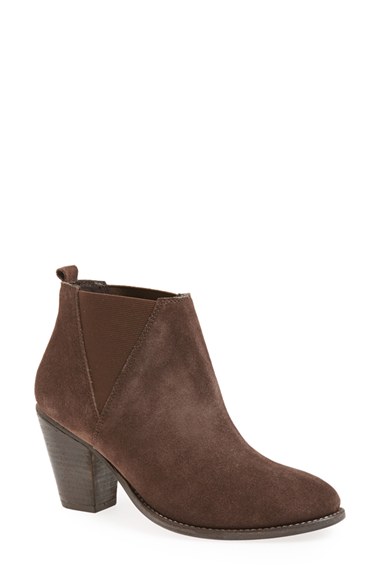 Triangular elastic insets perfect the fit of a suede bootie that displays its Western influences with distressed suede construction and a stacked woodgrain heel. Color(s): black, camel, dark brown. Brand: Charles by Charles David. Style Name: Charles by C