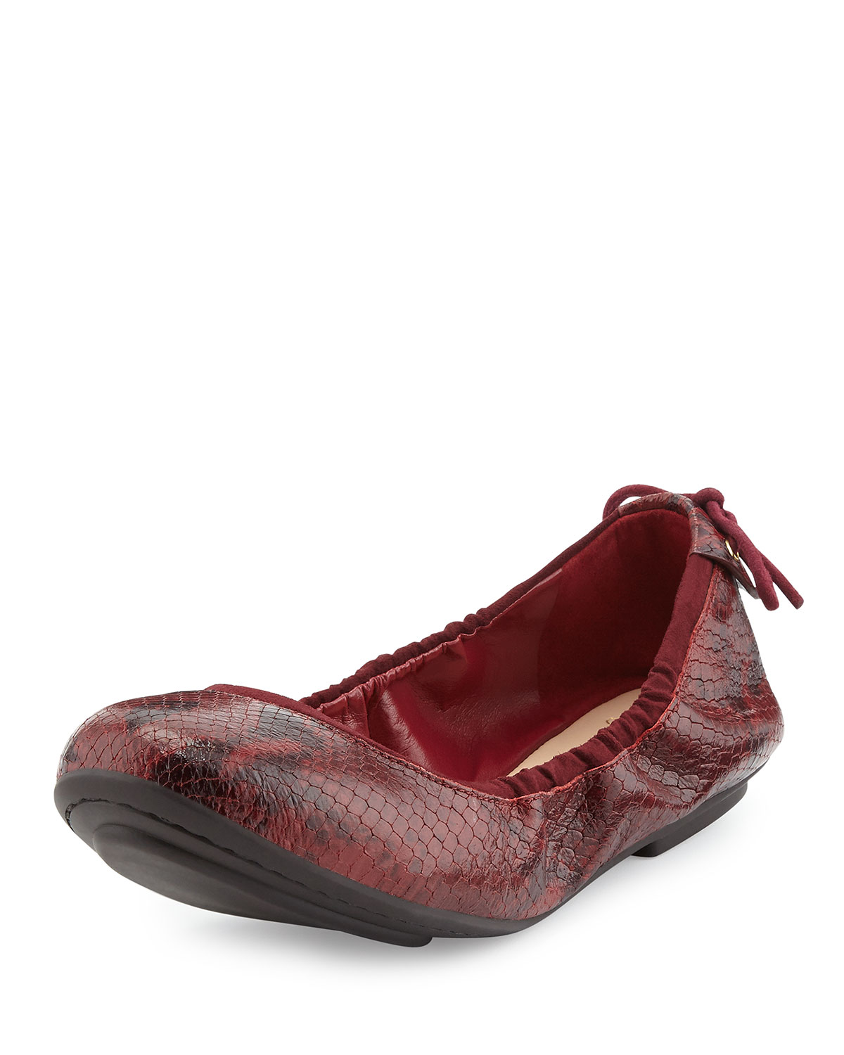 Cole HaanAshlyn Python-Embossed Ballet Flat, Tawny PortDetailsCole Haan python-embossed leather ballet flat.1/2" flat heel; 1/4" platform. Round toe. Contrast-trimmed stretch collar. Bow at heel counter. Padded insole; rubber outsole provides traction. Imported. Designer About Cole Haan: In 1928, Trafton Cole and Eddie Haan founded Cole Haan in Chicago as a men's shoe line known for exceptional quality and craftsmanship. Today, Cole Haan designs a wide range of shoes for women as well as men, along with a handbag collection, but the commitment to excellence remains the same. Many shoes in the collection feature Nike Air technology in a perfect balance of style and comfort.