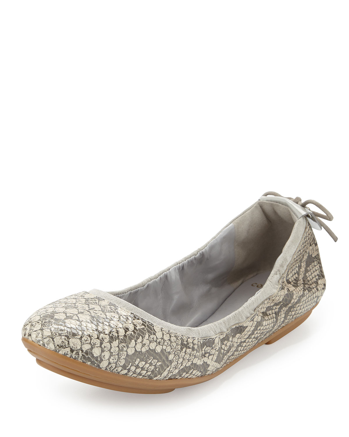 Cole HaanAshlyn Snake-Embossed Ballet Flat, PalomaDetailsCole Haan snake-embossed leather ballet flat. Round toe. Reinforced backstay with bow detail. Suede trim around collar. Cushioned leather footbed. Rubber outsole."Ashlyn" is imported. Designer About Cole Haan: In 1928, Trafton Cole and Eddie Haan founded Cole Haan in Chicago as a men's shoe line known for exceptional quality and craftsmanship. Today, Cole Haan designs a wide range of shoes for women as well as men, along with a handbag collection, but the commitment to excellence remains the same. Many shoes in the collection feature Nike Air technology in a perfect balance of style and comfort.