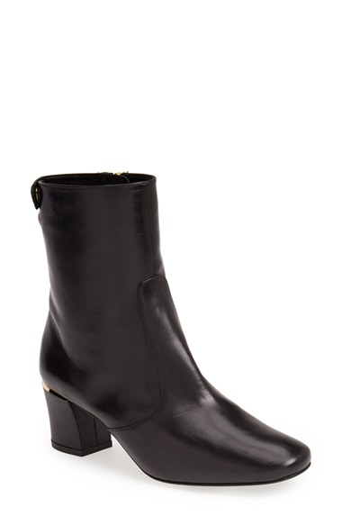 Soft calfskin leather and minimalist panels enhance the sleek silhouette of a short boot detailed with goldtone embellishment. Color(s): black, dark brown. Brand: Delman. Style Name: Delman 'Cryss' Leather Bootie (Women). Style Number: 43445.