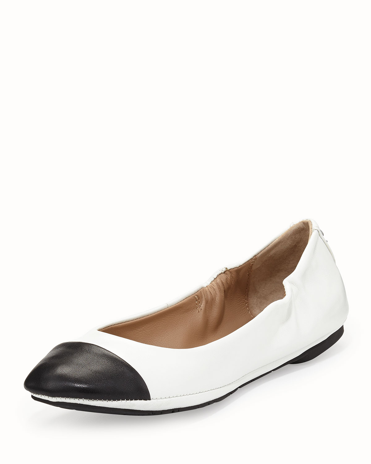 DelmanBlair Cap-Toe Ballet Flat, White/BlackDetailsDelman leather ballet flat.0.3" heel. Contrasting leather cap-toe. Padded insole. Signature emblem at counter."Blair" is imported.