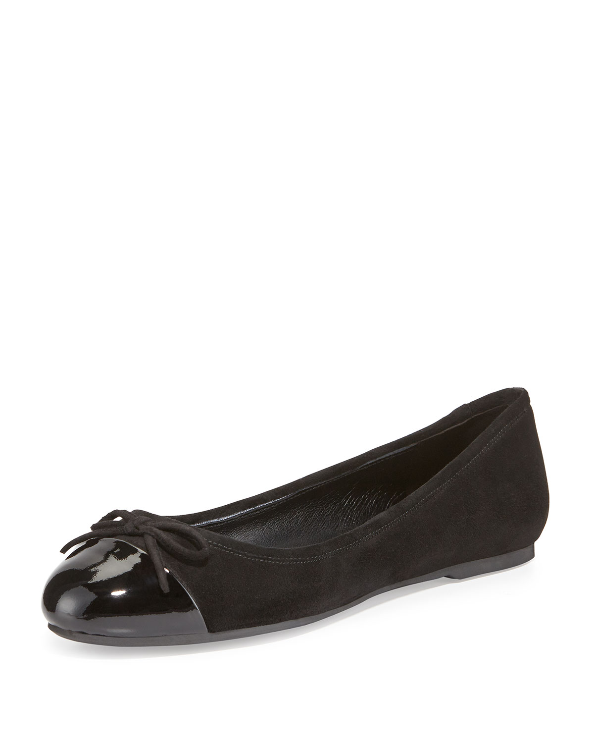 DelmanBlake Suede Cap-Toe Bow Ballet Flat, BlackDetailsDelman suede ballet flat. Patent leather cap-toe. Bow details vamp. Topstitched collar. Padded insole. Made in Spain.