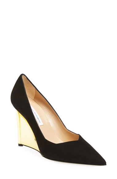 A gleaming gilt wedge heel lifts a lush suede pump designed with a mod, angular topline and a sultry pointy toe. Color(s): black suede/ mushroom. Brand: DIANE VON FURSTENBERG. Style Name: Diane von Furstenberg 'Balgo' Pump (Women). Style Number: