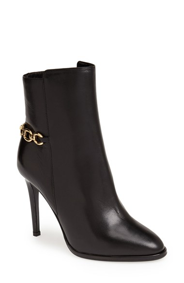 A gleaming goldtone chain adds subtle edge to a soft leather bootie lifted by a patent stiletto heel. Color(s): black nappa. Brand: DIANE VON FURSTENBERG. Style Name: Diane von Furstenberg 'Beckett' Almond Toe Bootie (Women). Style Number: 45980