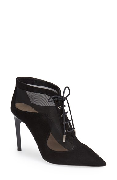Curvaceous mesh cutouts extend the modern allure of a striking suede bootie fashioned with a perfectly pointed toe. Color(s): black suede/ black mesh. Brand: DIANE VON FURSTENBERG. Style Name: Diane von Furstenberg 'Bop' Bootie (Women). Style Nu