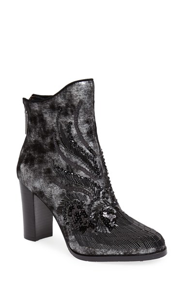 Shimmering distressed leather composes a Western-inspired bootie drenched in beads and baubles for modern drama. Color(s): gunmetal. Brand: Donald J Pliner. Style Name: Donald J Pliner 'Quiva' Bootie (Women). Style Number: 730338.