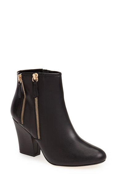 Twin goldtone zippers beautifully contrast against the black upper of a glamorous bootie set on a sculpted heel. Color(s): black leather, black suede. Brand: Dune London. Style Name: Dune London 'Noras' Bootie (Women). Style Number: 848253.