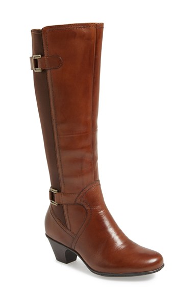 Polished silvertone buckles secure the adjustable straps on a perfectly proportioned boot cast in glove-soft calfskin leather and shaped with tonal elastic in back for a comfortable fit. Cushioned arch support adds lasting comfort, and a high-density foam midsole provides excellent support. Color(s): almond, black. Brand: Earth. Style Name: Earth 'Rider' Stretch Tall Boot (Women). Style Number: 730021.