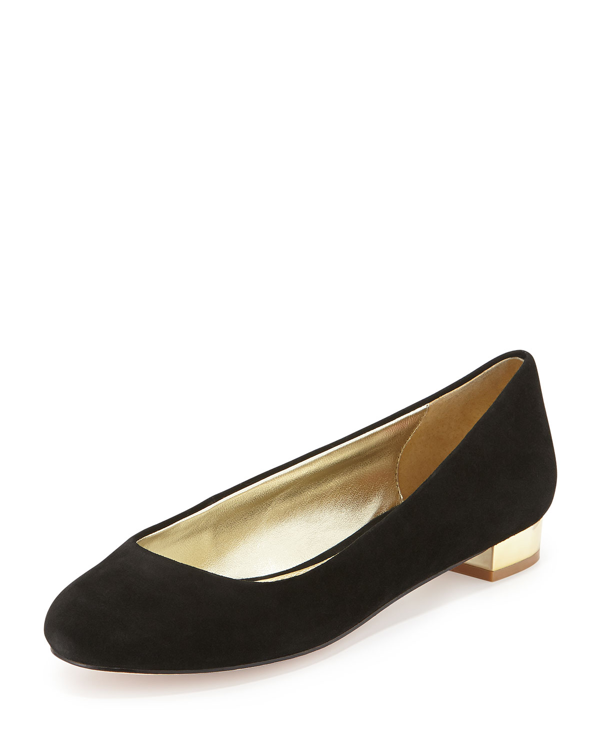 Elaine Turner DesignsLane Suede Leather Ballet Flat, BlackDetailsElaine Turner suede leather upper. Round toe. Low cut vamp. Leather lining and cushioned insole.75" golden covered flat heel. Leather sole."Lane" is imported.