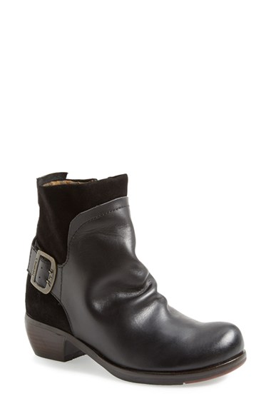 An antiqued buckle details the shaft of a distressed leather and suede bootie cast in a trend-right slouchy silhouette. Color(s): black, petrol, red. Brand: FLY LONDON. Style Name: Fly London 'Mel' Leather Bootie (Women). Style Number: 467938.