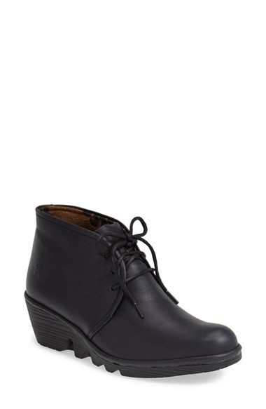 A curved topline accentuates the streamlined silhouette of a lace-up bootie set on a heavily lugged wedge heel. Color(s): navy. Brand: FLY LONDON. Style Name: Fly London 'Pert' Wedge Bootie (Women). Style Number: 467261 2.