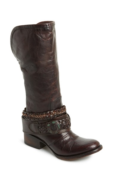 A boot with a been-there, done-that vibe, this rugged Western style features a slightly slouchy silhouette, a notched topline and an authentic, hand-distressed finish. A removable decorative strap gives you double the styling options. Color(s): brown. Brand: Freebird by Steven. Style Name: Freebird by Steven 'Brek' Leather Boot (Women). Style Number: 822317.