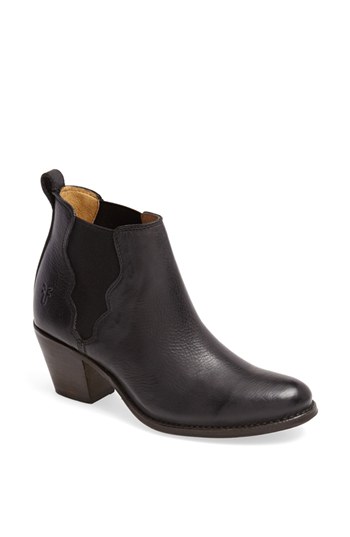 Scalloped elastic-gore side panels heighten the rugged, vintage vibe of a bench-crafted ankle boot cast in rich, distressed leather. Bench-crafted by hand, Frye s 150-year-old heritage of quality leatherwork is evident in every style. Color(s): black, sad