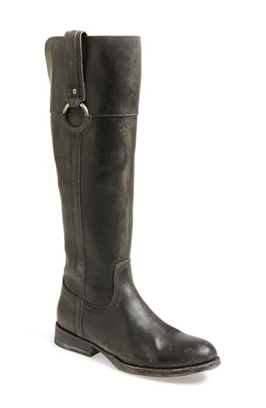 Frye's 150-year heritage of quality leatherwork is evident in a stonewashed riding boot detailed with partially-covered, antiqued-brass ring hardware and set on a low woodgrain heel. Color(s): black, bordeaux brown, whiskey. Brand: FRYE. Style Name: