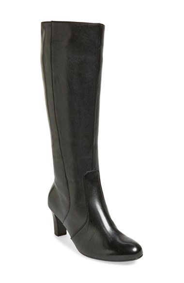Tonal topstitching subtly highlights the clean, classic lines of an indispensable knee-high boot fashioned with a side stretch panel to ensure a custom fit. Color(s): black calf. Brand: Gabor. Style Name: Gabor Knee-High Leather Boot (Women). Style Number