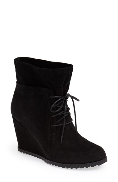 A wrapped wedge heel elevates a sophisticated lace-up bootie cast in lush suede. A loose-fitting collar creates a slouchy silhouette that furthers the trend-right appeal. Color(s): black. Brand: Gentle Souls. Style Name: Gentle Souls 'Gabel' Wed
