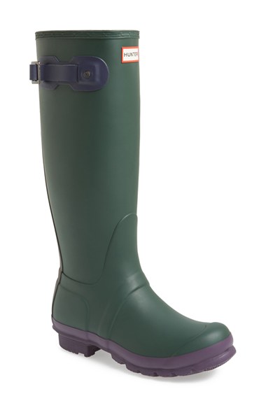A classic finish and color contrasts perfect a puddle-proof rubber boot finished with a traction-gripping sole. Color(s): burgundy/ green/ chocolate, forest green/ chocolate/ plum, midnight/ chocolate/ burgundy. Brand: Hunter. Style Name: Hunter Original