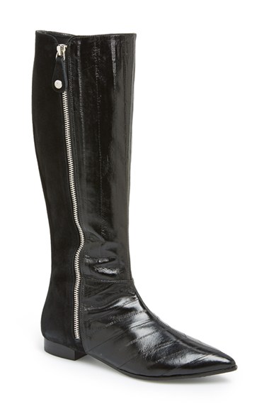 Genuine eelskin and rich suede make this exquisite boot an absolute style standout. A pointed toe and exposed zippers add polished detailing to this fashion-forward staple. Color(s): black, brown. Brand: J.Renee. Style Name: J. Renee 'Glider' Ta
