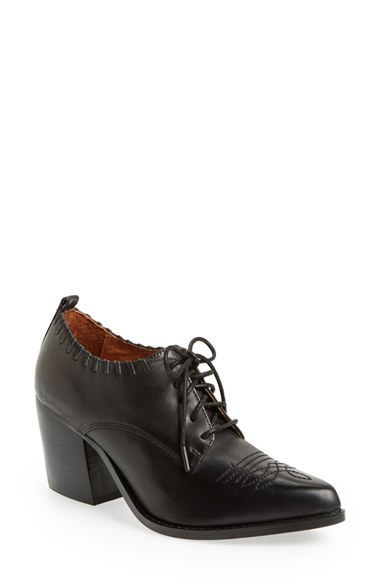 Decorative stitching adds a Western-inspired vibe to a leather lace-up bootie set on a no-nonsense, stacked heel. Color(s): black. Brand: JEFFREY CAMPBELL. Style Name: Jeffrey Campbell 'Wilkes' Pointy Toe Bootie (Women). Style Number: 865512.