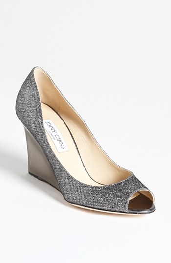 A sculpted wedge cast in polished metal lifts a glittering metallic pump with a flirty peep toe. Color(s): anthracite, gold, light bronze. Brand: Jimmy Choo. Style Name: Jimmy Choo 'Baxen' Wedge Pump. Style Number: 687994.