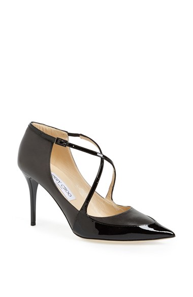 High-shine patent leather accentuates a pristinely pointed toe and leads into the slim, curved straps of a graceful pump with a vintage aesthetic. Color(s): asphalt/ black, nude/ black. Brand: Jimmy Choo. Style Name: Jimmy Choo 'Madera' Pump. St