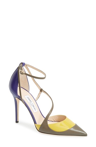 A twist here, a curve there-Jimmy Choo adds instant allure to a color-blocked d'Orsay pump with a tantalizing array of asymmetrical straps. Color(s): khaki green. Brand: Jimmy Choo. Style Name: Jimmy Choo 'Mutya' Pointy Toe Pump (Women). Style Number: 836983.