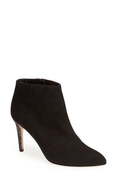 Add brilliance to any ensemble with this sleek pointy-toe ankle boot that perfectly blends the class of a rich suede upper with the sass of a glittery heel. Color(s): black. Brand: kate spade new york. Style Name: kate spade new york 'niko' pointy toe suede bootie (Women). Style Number: 703430.