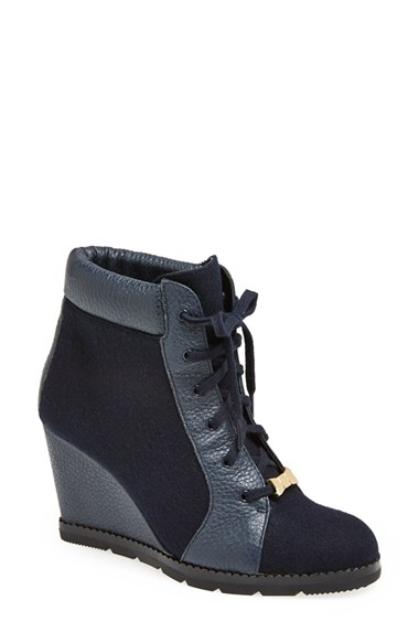 A polished goldtone bow charm accents the laces of a leather-and-flannel wedge bootie fitted with an on-trend stacked sole. Color(s): navy. Brand: kate spade new york. Style Name: kate spade new york 'saja' wedge bootie (Women). Style Number: 819242 1.